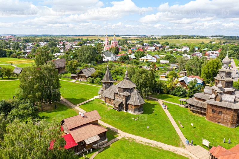 Суздаль, Россия. Церковь Преображения из села Козлятево, перевезенная в Суздаль - памятник деревянной архитектуры середины 18 века. Вид с воздуха