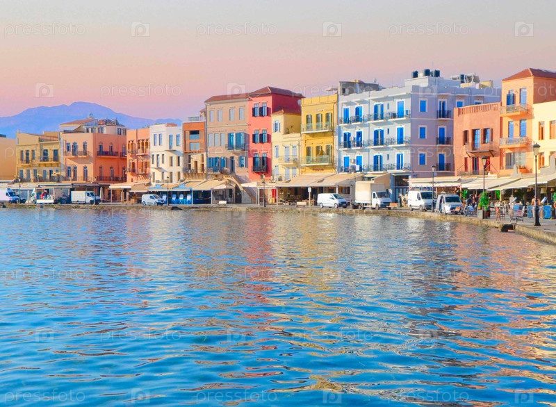Венецианская гавань Ханья с историческими домами в солнечный день, Крит, Греция