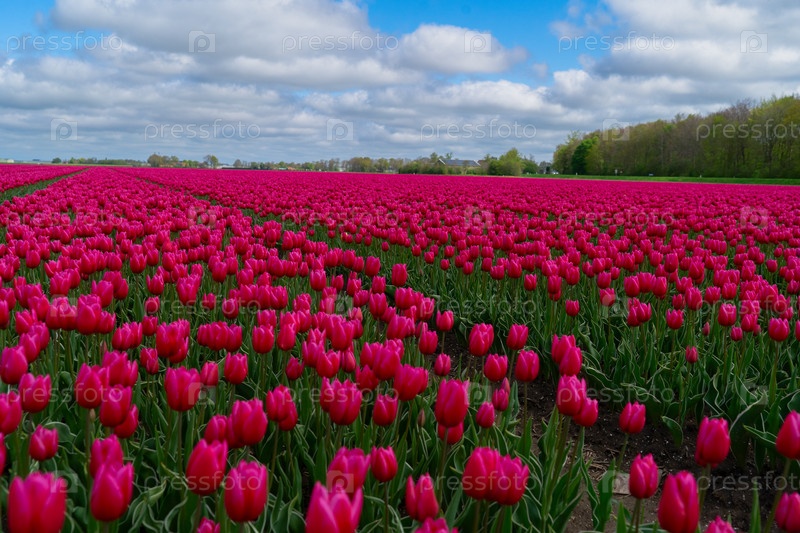 Famouse dutch opink tulip field с рядами в солнечный день с голубым небом