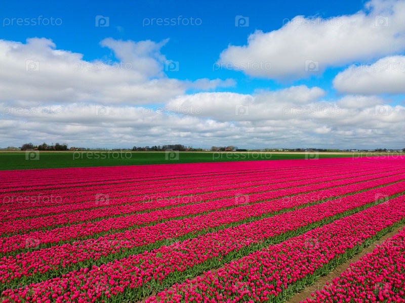 Поле тюльпанов Famouse dutch с рядами в солнечный день с голубым небом