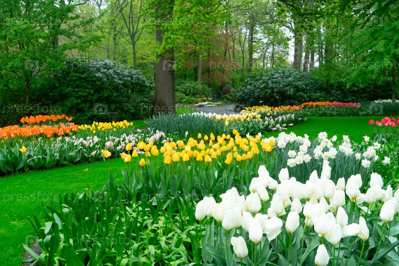Красочный путь в саду тюльпанов, демонстрирующий яркие цветы в пышной обстановке, приглашающий посетителей исследовать
