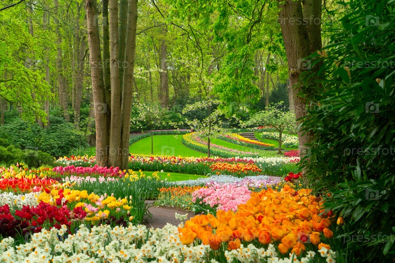 Красочный путь в саду тюльпанов, демонстрирующий яркие цветы в пышной обстановке, приглашающий посетителей исследовать