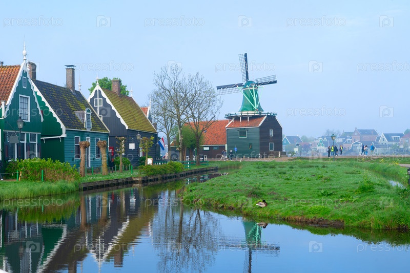 Граница сельской голландской страны небольшой старый город Zaanse Schans с ветряными мельницами, Нидерланды