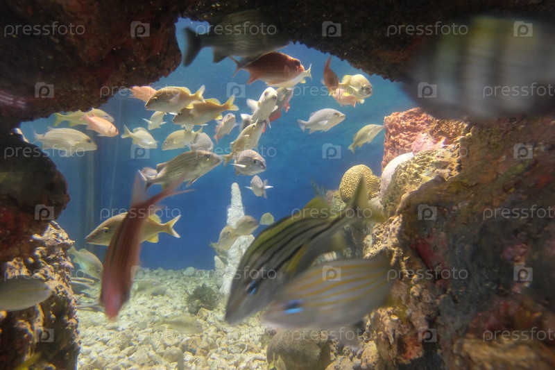 Рыба плавает в подводном мире в океанариуме в Доминиканской республике