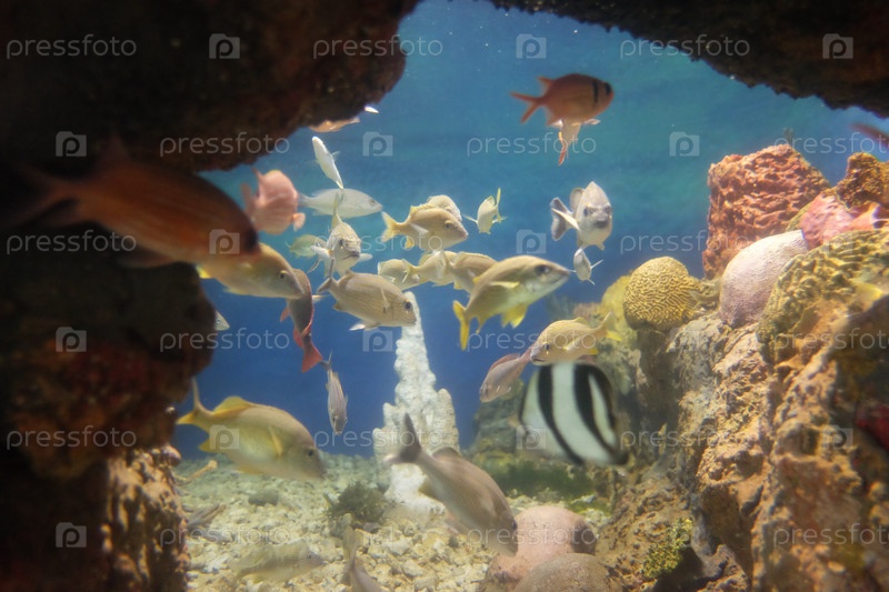 Рыба плавает в подводном мире в океанариуме в Доминиканской республике