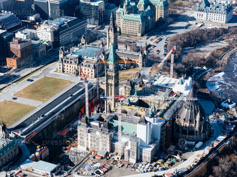 Вид с воздуха на Оттаву и Гатино с рекой, мостами и городским ландшафтом под ясным небом. г