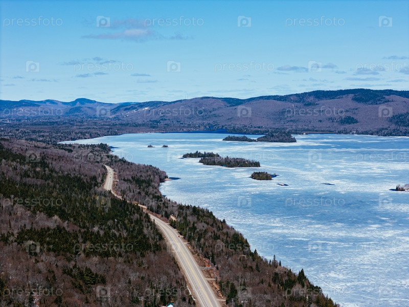 Вид с воздуха на извилистую дорогу вдоль замерзшего озера в Квебеке с лесом и горами под голубым небом. г
