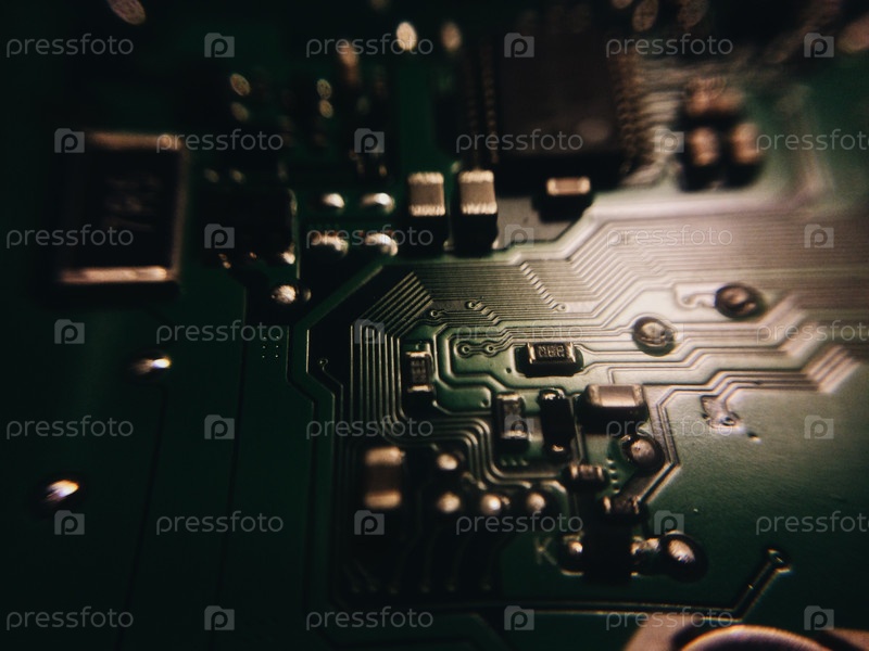 Электронная плата с треками и процессором, крупным планом, макрос