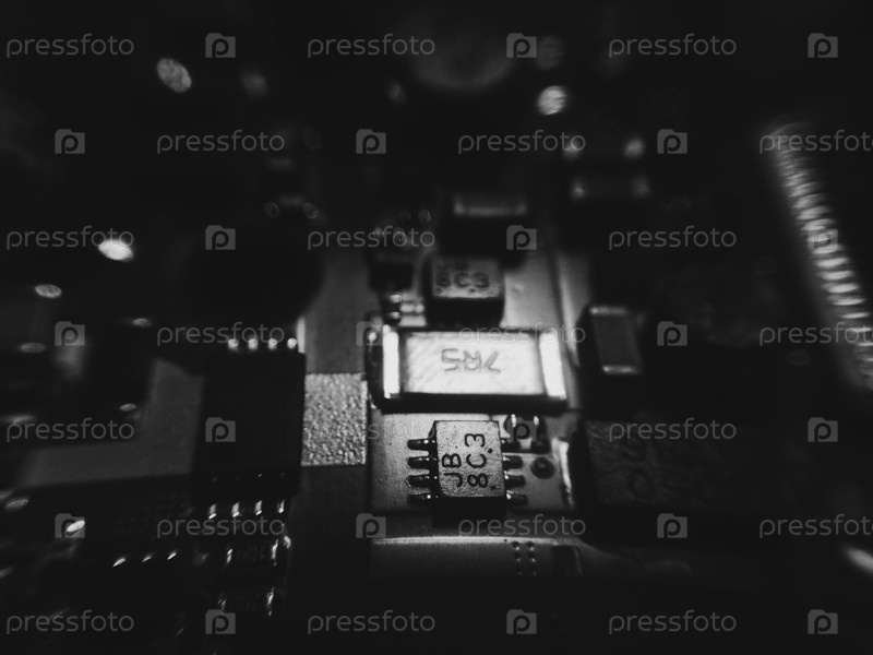 Электронная плата с треками и процессором, крупным планом, макрос
