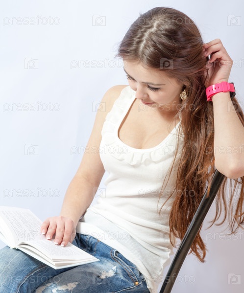 Женщина в джинсах читает книгу, сидя на стуле