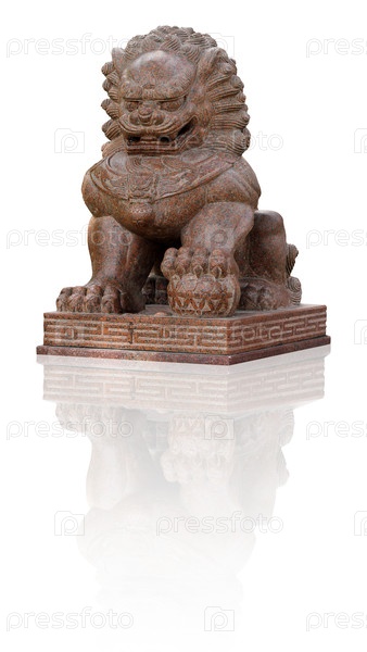 Китайский или императорский сторожевой лев. Каменная статуя на гранитном постаменте изолирована на белом фоне. Элемент дизайна с обрезкой пути