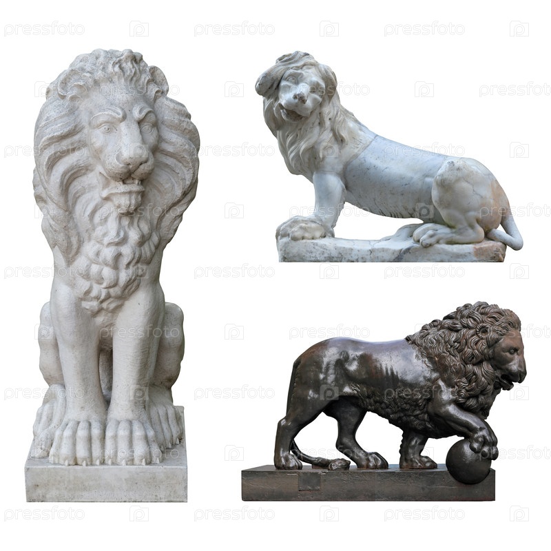 Статуя каменного льва изолирована на белом фоне. Элемент дизайна с обрезкой пути