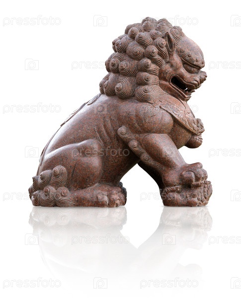 Китайский или императорский сторожевой лев. Каменная статуя на гранитном постаменте изолирована на белом фоне. Элемент дизайна с обрезкой пути