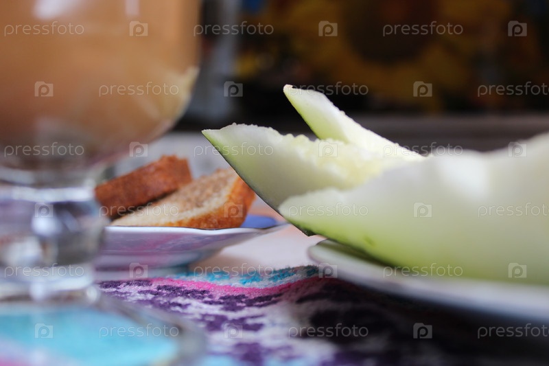Миска с ломтиками дыни на столе крупным планом