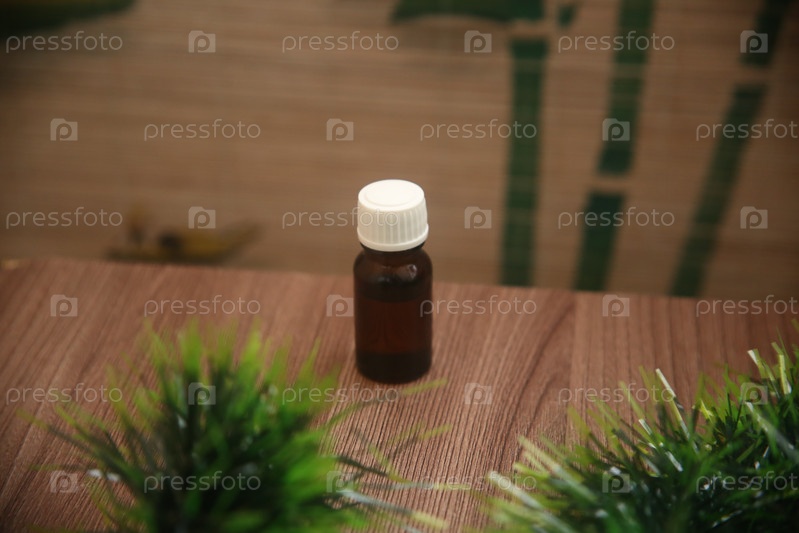 Бутылочка с кедровым маслом для массажа на деревянном столе