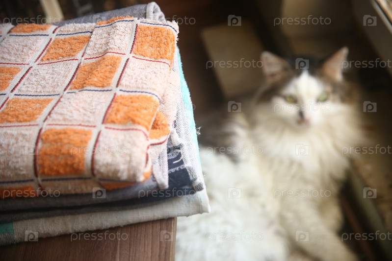 Махровые полотенца на столе на фоне кота