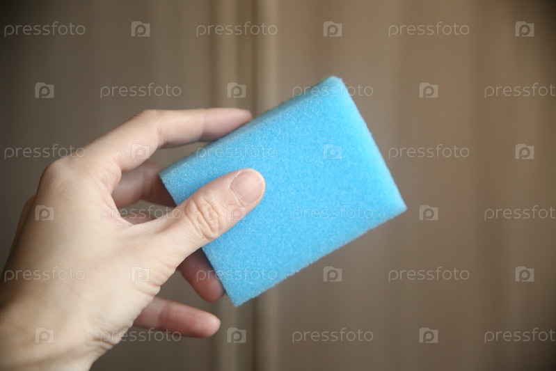 Женская рука, протирающая пыль в комнате поролоновой губкой