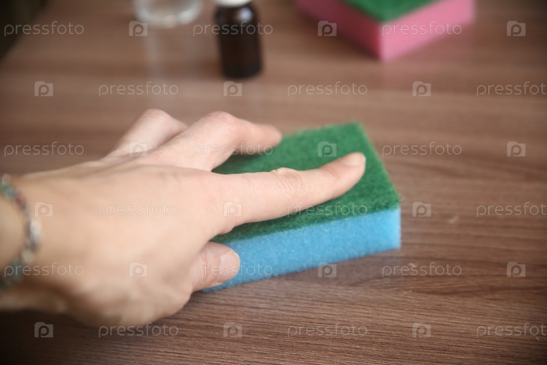 Женская рука, протирающая пыль в комнате поролоновой губкой