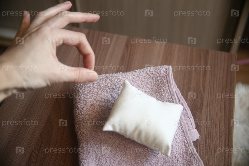 Маленькая подушка, полотенце на столе и женская рука, показывающая класс