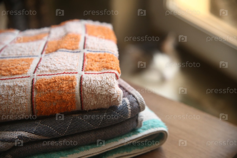 Махровые полотенца на столе на фоне кота
