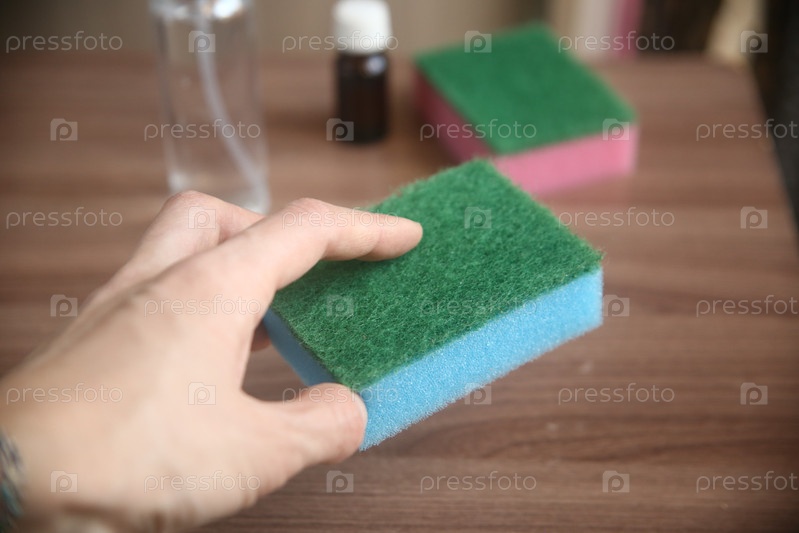 Женская рука, протирающая пыль в комнате поролоновой губкой