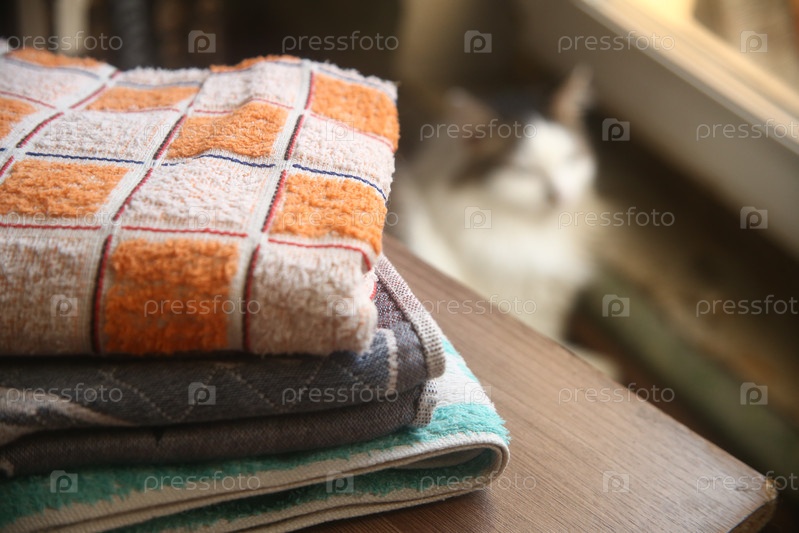 Махровые полотенца стопкой лежат на столе на фоне кота