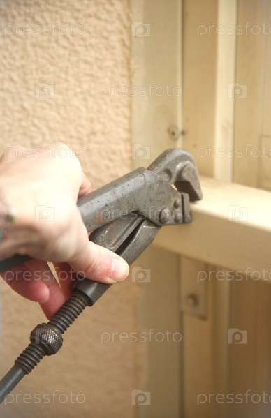 Мужчина ремонтирует трубным рычажным разводным ключом деталь