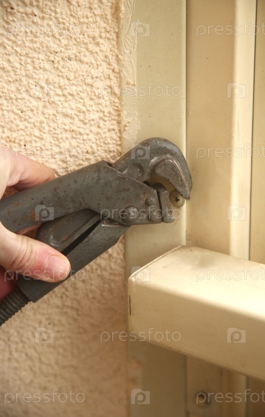 Газовый трубный рычажный ключ для ремонта в мужской руке