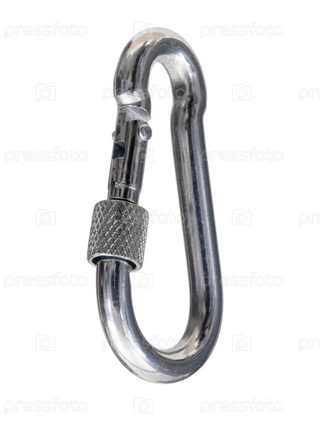 Стальной карабинный клип выделен на белом фоне, вырез готов. Чрезвычайно высокое разрешение
