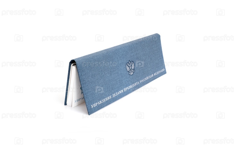 Дневник в синей кожаной обложке изолирован на белом фоне. Надпись на русском языке «Дирекция Президента Российской Федерации»