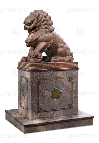Китайский или императорский сторожевой лев. Каменная статуя на гранитном постаменте изолирована на белом фоне. Элемент дизайна с обрезкой пути