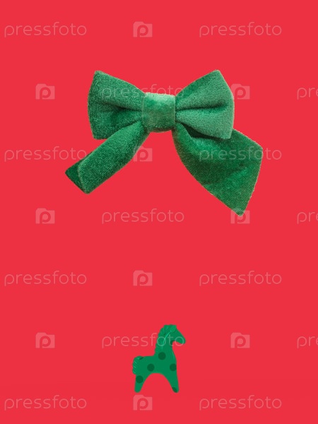 Рождественская иллюстрация лошади с зеленым луком на красном фоне. Год концепта лошади. Чрезвычайно высокое разрешение