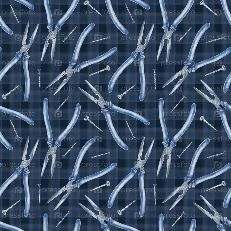 Акварель бесшовный рисунок с мужскими инструментами. Плиеры и саморезы на темном клетчатом фоне. Реалистичный, повторяющийся шаблон для проектирования услуг по ремонту и строительству дома
