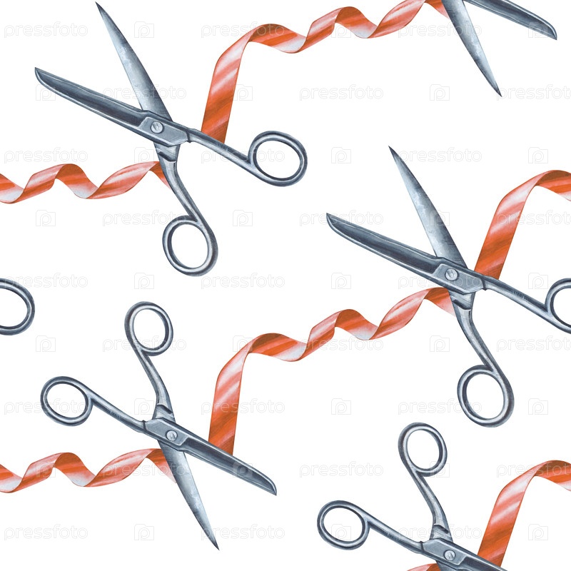 Диагональный бесшовный рисунок с красной лентой и железными ножницами. Акварельная иллюстрация с рабочими инструментами швеи на изолированном фоне. Реалистичный фон для упаковки, обоев, текстиля