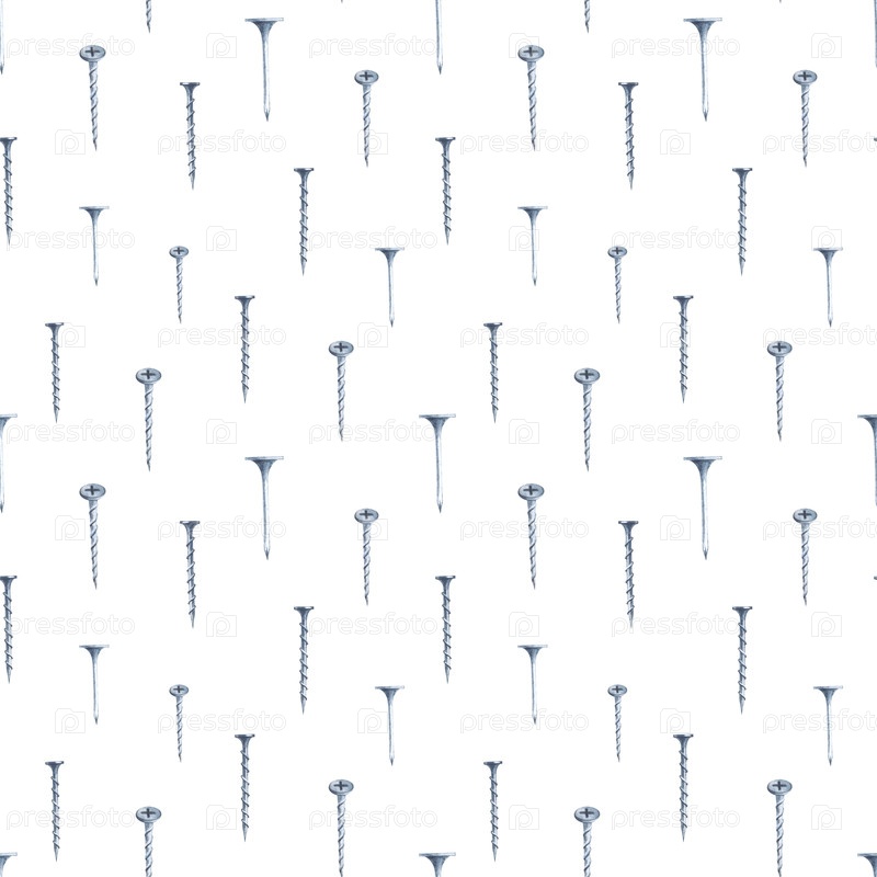 Вертикальный бесшовный рисунок с железными саморезами и гвоздями на изолированном фоне. Реалистичные акварельные иллюстрации для упаковки, изготовления обоев, оберточной бумаги, а также для украшения ремонтных и строительных мастерских