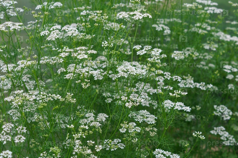 Петрушка цветет белыми цветами на грядке