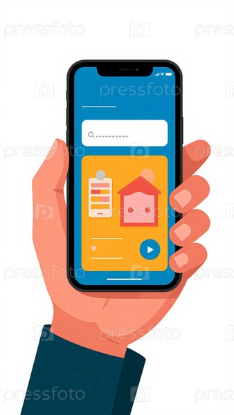 Смартфон в руках. На экране смартфона символы и знаки, текст и иконки