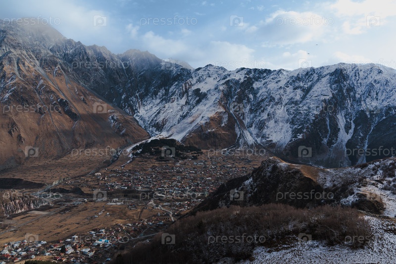 Панорама горного села у подножия заснеженных Кавказских гор, Грузия