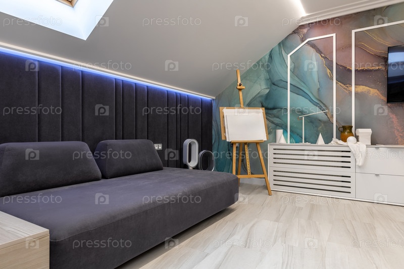 Современный интерьер чердака с темно-синей бархатной обивкой за модульным серым диваном, деревянным мольбертом художника и яркой абстрактной стенной росписью рядом с минималистскими белыми хранилищами под наклонным потолком