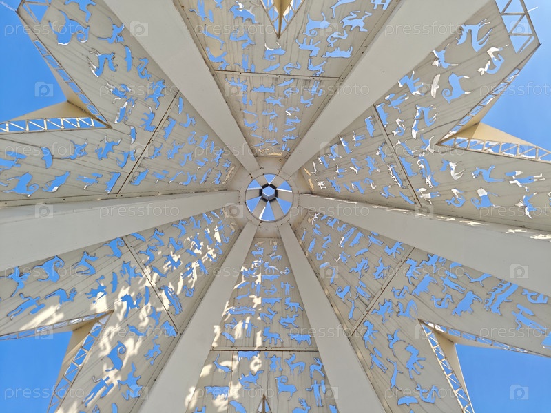 Стелла границы Республики Алтай, скульптура юрты и турист с собакой. Стелла на границе Республики Алтай, скульптура двора и турист с собакой