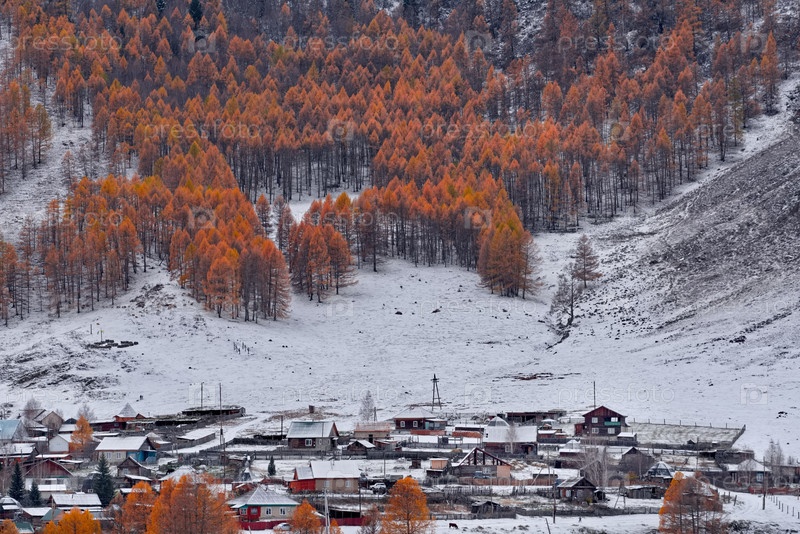 Россия. Юг Западной Сибири, горный Алтай. Первый осенний снег в горном поселке возле районного центра Усть-Кан