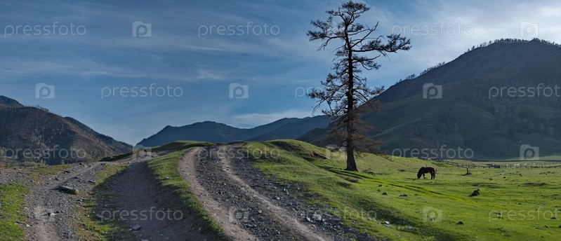 Россия, юг Западной Сибири, Горный Алтай. Весенний вид на пастбище дороги с одинокой лиственницей в горной долине реки Сары-Ачек недалеко от села Улаган