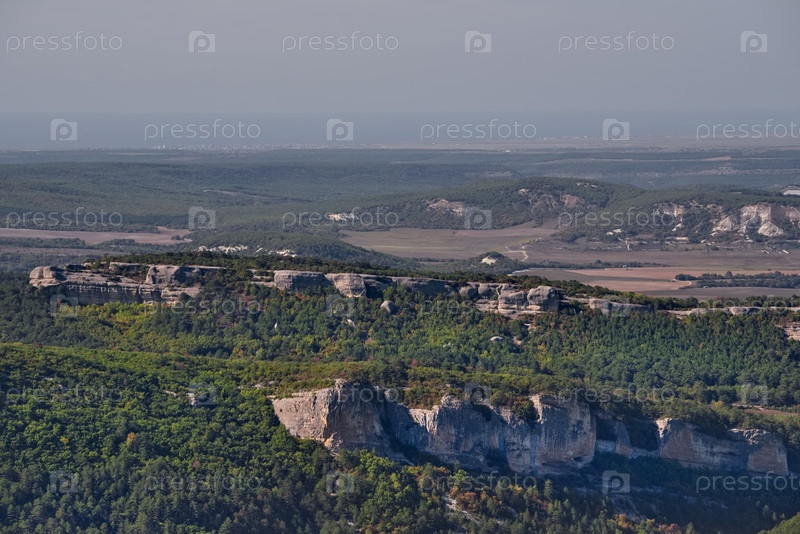 Россия, Республика Крым. Вид на полуразрушенные горы с вершины полуразрушенной каменной крепости знаменитого города Мангуп-Кале V века в Бахчисарайском районе