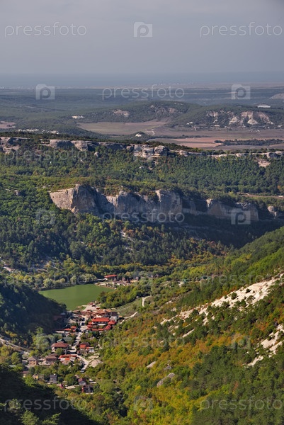 Россия, Республика Крым. Вид на полуразрушенные горы с вершины полуразрушенной каменной крепости знаменитого города Мангуп-Кале V века в Бахчисарайском районе