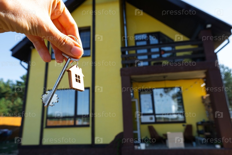 Ключ к дому с крошечным домом в руках владельца рядом с коттеджем - продажа, переезд, бронирование, проект коттеджа, ипотека, страхование жилья и недвижимости