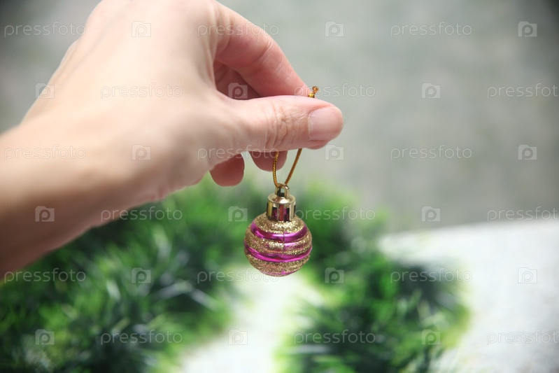 Новогодняя елка, мишура и праздничная игрушка в руке