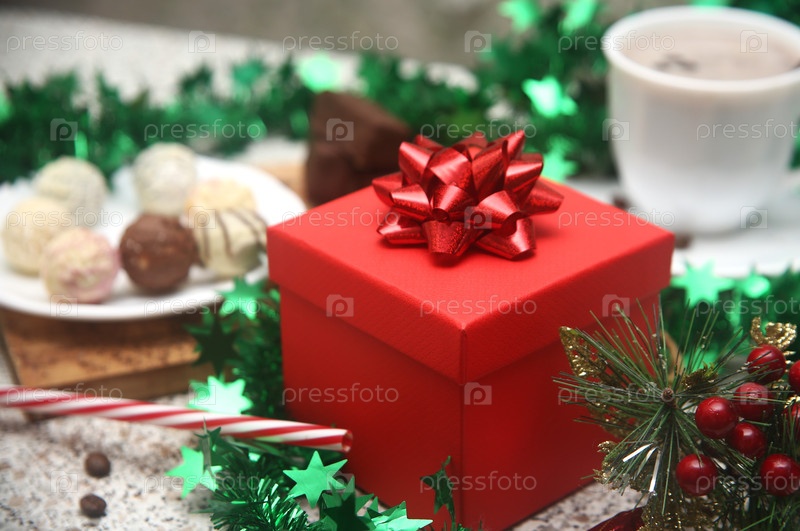 Красная подарочная коробка, конфеты и мишура с новогодним декором на столе
