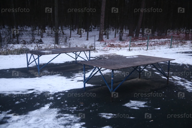 Зимний пейзаж с деревьями и столами для тенниса в снегу
