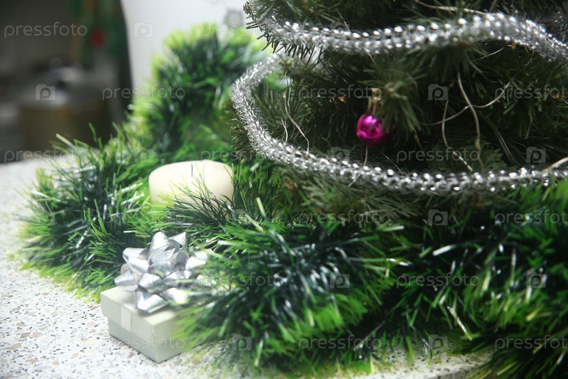Подарочная коробочка с бантиком и новогодней елкой на столе