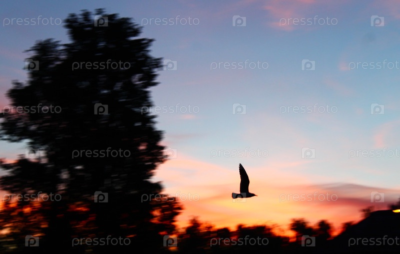 Летний вечерний пейзаж сельской местности с деревьями и пролетающей птицей